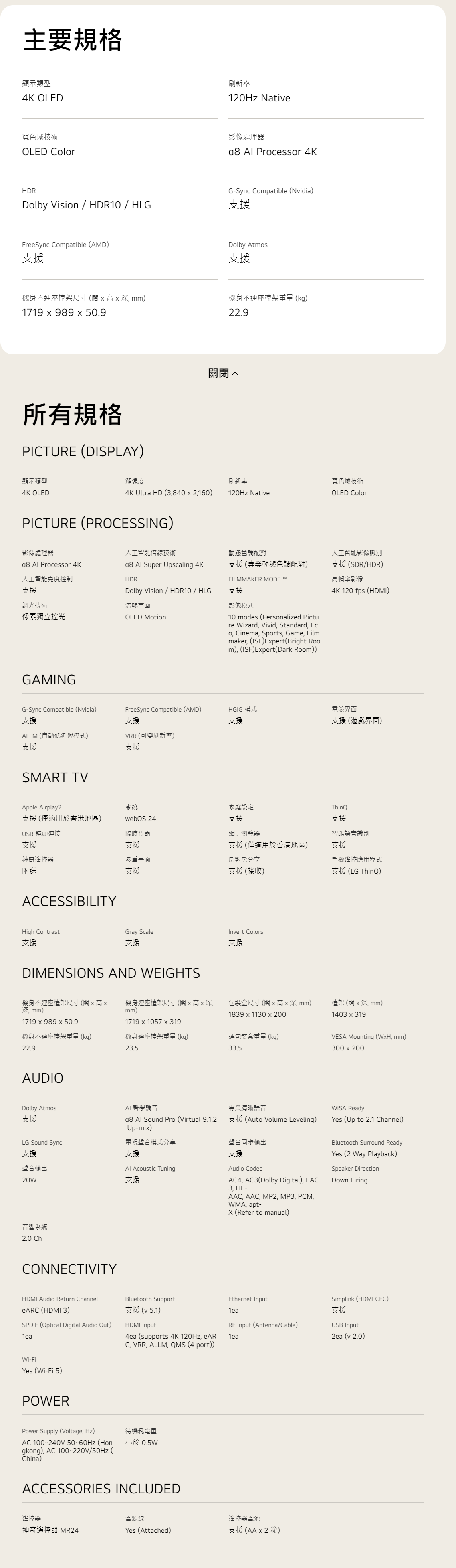 尺寸 : 闊x高x深(毫米) (不連底座) 1719 x 989 x 50.9