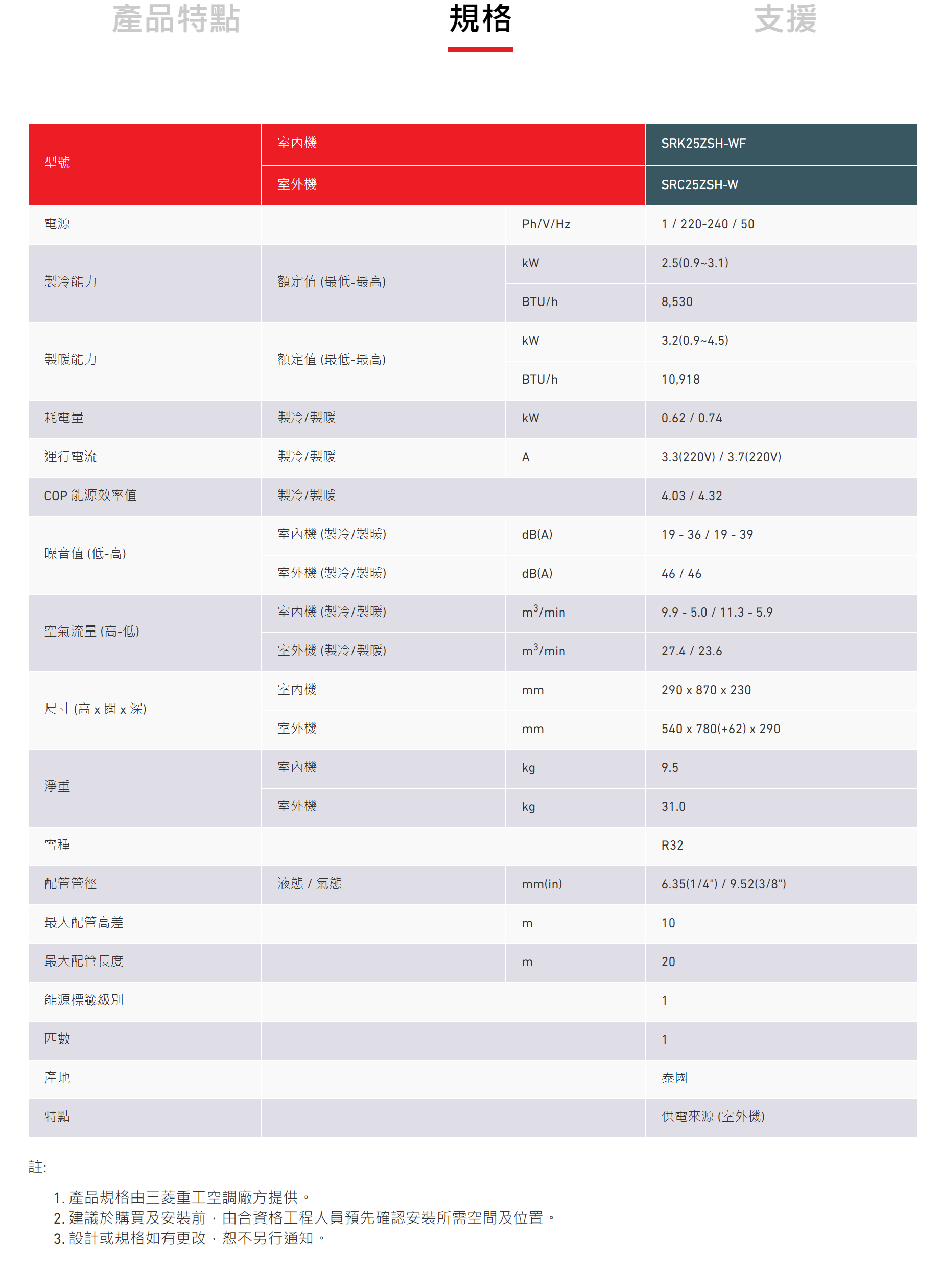 MITSUBISHI HEAVY INDUSTRIES 三菱重工 SRK25ZSHWF 一匹 變頻冷暖掛牆分體式冷氣機 (附遙控)